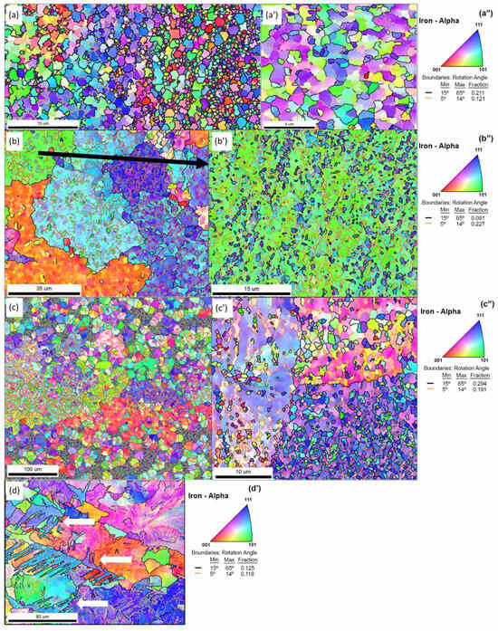 EBSD crystallographic orientation maps for iron α (inverse pole figure) of Al-06, Al-07, Al-11 at a large scale (a–c) and a low scale (a′–c′) and of Al-03 (d). White arrows show Widmanstätten patterns. (a″–c″,d′) Color code of the inverse pole figures and grain boundary misorientations.