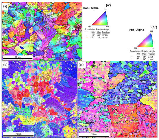 EBSD crystallographic orientation maps for iron α (inverse pole figure) of R-01 (a), with the white arrow showing Widmanstätten patterns, and of R-02 at a large scale (b) and a low scale (b′). (a′,b″) Color code of the inverse pole figures and grain boundary misorientations.