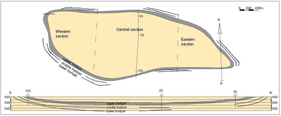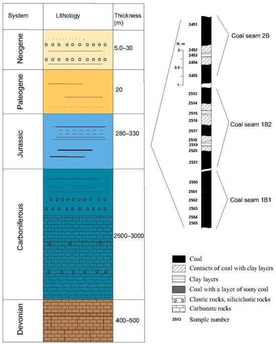 Figure 2). Industrial coal mining takes place in the lower part of the Jurassic sedimentary section, where three coal seams are distinguished: the upper, middle, and lower seams. The upper seam, which is currently being mined using an open-pit method, is considered to be the most promising for future development.