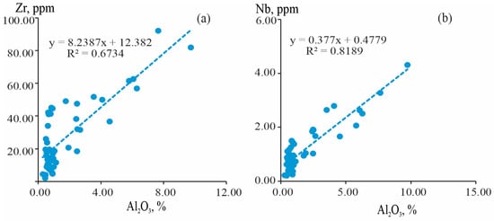 The correlation analysis of Nb and Ta in the coals from the Shubarkol deposit showed that there was a significant correlation between these elements (r = 0.94). Considering that Zr and Nb are generally considered to have an inorganic affinity in high-grade coals (bituminous or anthracite) [