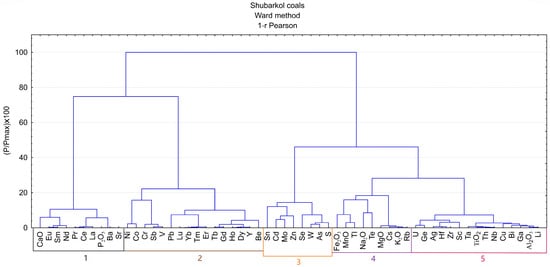 20]. Statistical methods are some of the most frequently used indirect approaches for the interpretation of elements’ modes of occurrence. These methods include the coefficient of correlation between the elements, as well as cluster and factor analysis. In this work, using data obtained from 120 samples from the Shubarkol deposit, it is demonstrated that statistical analysis with slightly different sets of elements can lead to significantly different conclusions regarding the elements’ modes of occurrence. Here, it is assumed that statistical methods can provide useful information about the modes of occurrence of trace elements for a limited set of samples. This is supported by previously obtained data on the accumulation of trace elements in coal, which may be a potential method for extracting metals from coal deposits and dumps. This approach is relevant to industrial and commercial applications because it reduces disposal costs and minimizes harmful environmental impact.