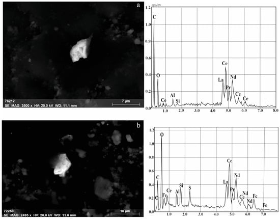 33], the predominant form of a rare earth element (organic matter or mineral substance) cannot be determined. The positive correlations between La and Ce and between Nd and Pr may also indicate that the micromineral monazite is a common host mineral.