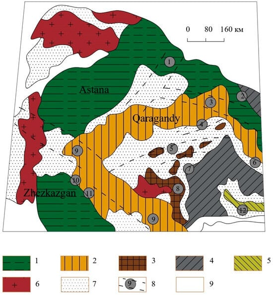 The frame structures of the Shubarkol deposit include Early and Middle Caledonian igneous complexes—mainly granites, leucogranites, granodiorites, diorites, and monzodiorites. Thus, in the west, there are large outcrops of Precambrian massifs such as Ulytau and Sarysu-Tenizsky (Kireisky ledge), consisting of granodiorite and albite alkali–feldspar complexes. To the east of the Shubarkol deposit, there is the western part of the Central Kazakhstan volcanic–plutonic belt, consisting mainly of granites, andesites, and trachyte, as well as rocks from the alkaline series: syenogabbro, monzonite, granosierite, and syeno-granite. Thus, secondary geological processes such as the destruction and transformation of ancient magmatic complexes likely contributed to the formation of geochemical associations in the sedimentary rocks in the Shubarkol coal basin.