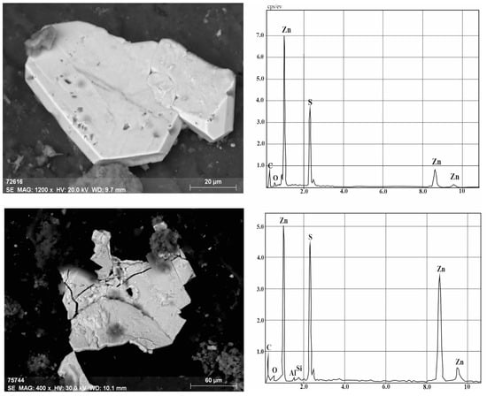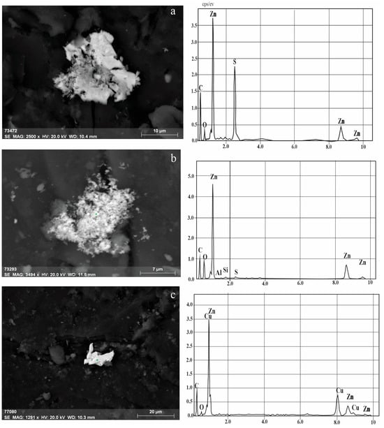 Figure 10b,c). Zincite was mainly represented by earthy masses on the surface of the coal (