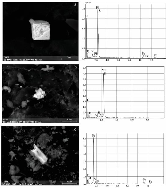 Figure 12a). The forms of galena and clausthalite were similar—hexagonal, flattened crystals and irregularly shaped grains. There were both single grains and clusters occupying small areas. Galena aggregates filled cracks and pores. Weathered selenides formed earthy masses, and an admixture of mercury (4%) was occasionally found in their composition. The composition of the oxidation product of clausthalite corresponded to molybdenum (