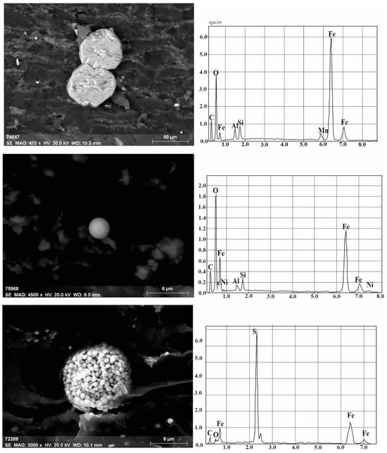 The “micaceous” factor combined elements (Fe, Mg, K, Ce) associated with micas, mainly biotite. They form in pores or cracks together with clay minerals. Iron predominated in oxide and sulfide forms. Flattened crystals of hematite or goethite were often found on the surface of the coal, as they were formed by cracks. They were often assembled into aggregates, forming millimeter-sized plates. Up to 2% manganese was present in the composition of the minerals. Hydrogetite occurred as sedimentary and earthy formations. Pyrite was found mainly in the form of framboidal and individual grains (tetrahedral, octahedral, and hexahedral forms and their combinations). Often, pyrite grains filled cracks, or plate-like aggregates formed along the cracks; a star-shaped aggregate composed of lamellar grains of pyrite (marcasite) was identified. Single grains of pyrite contained impurities of selenium and manganese. Pyrite framboids (