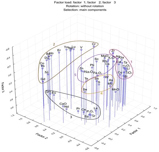 Figure 3). The second and third factors, “rare earth” and “phosphate”, with weights of 20.3% and 14.5%, respectively, could be combined into a phosphate–rare earth association, corresponding to the “phosphate” and “rare earth” clusters in