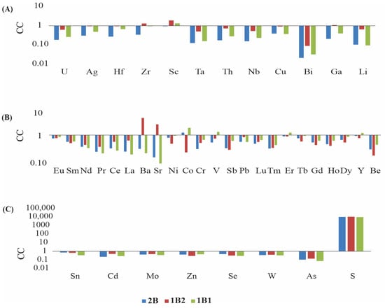 Figure 15. The concentrations of the trace elements are close to (0.5 < CC < 5) or considerably lower than the average concentrations for worldwide coals [