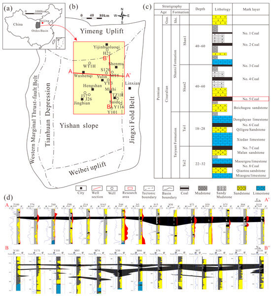 (a) The location of the Ordos Basin. (b) The tectonic feature of the Ordos Basin. (c) The typical lithology column of the Cisuralian in the Ordos basin. (d) West–east (A,A’) and south–north (B,B’) well-tie section.