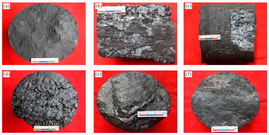 (a) Mudstone, S120 well, 2647 m; (b) black bright coal, Y116 well, 2152 m; (c) black bright coal, Y116 well, 2153.4 m; (d) semi-bright coal, S120 well, 2469.5 m; (e) semi-dull coal, Y101 well, 2359.5 m; (f) mudstone with carbonized plant fossils, Y101 well, 2365.5 m.