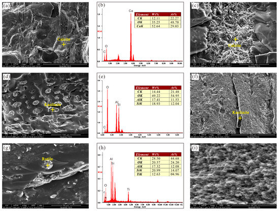Images in the samples under secondary electron. (a) Vitrinite and its surface film-like minerals (mainly calcite), H21 well, 2558.47 m; (b) EDX spectrum of calcite; (c) mixture of minerals (alcite, clay minerals), MT5 well, 2324.6 m; (d) fusinite filled with kaolinite and calcite, TZ1H well, 2298.88 m; (e) EDX spectrum of kaolinite; (f) kaolinite, J37 well, 3370.17 m; (g) rutile and kaolinite filling interlayer cracks, WT1H well, 3163.8 m; (h) EDX spectrum of rutile; (i) clay and organic components mixed, WT1H well, clay minerals, 3158.69 m.