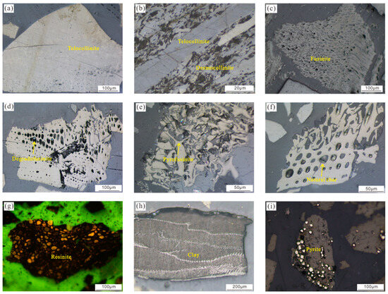 The liptinite is less common, appearing in only a few samples with contents ranging from 0% to 15.3%, with an average of 2.8%. It mainly consists of resinite (Figure 4g) and exsudatinite. Resinite are typically present in coal as in situ cell fillers or isolated forms and exhibit blue–green fluorescence under ultraviolet light. Inorganic mineral components range from 1.9% to 52.7%, with an average of 8.5%, consisting primarily of clay minerals and pyrite. Clay minerals are predominantly kaolinite (Figure 4h), found within the fusinite and telovitrinite. Strawberry pyrite is embedded within vitrinite (Figure 4i).