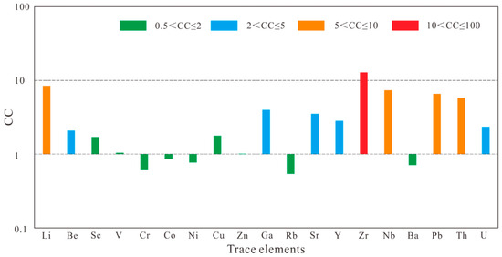 Trace element data for the coal seam in the Shanxi Formation of the Ordos Basin are presented in Figure 5 and Table 4. This study utilized the concentration coefficient (CC), defined as the ratio of trace elements content in coal to the global average for coal, to assess the relative enrichment or depletion of trace elements. Based on the classification [31], CC values were categorized into six levels: depleted (CC ≤ 0.5), normal (0.5 < CC ≤ 2), slight enrichment (2 < CC ≤ 5), enrichment (5 < CC ≤ 10), high enrichment (10 < CC ≤ 100), and abnormal enrichment (CC > 100). Relative to global coal averages [32], Zr is highly enriched (CC = 12.87), Li, Nb, Pb, and Th are enriched, Be, Ga, Sr, Y, and U are slightly enriched, while other trace elements fall within normal levels.