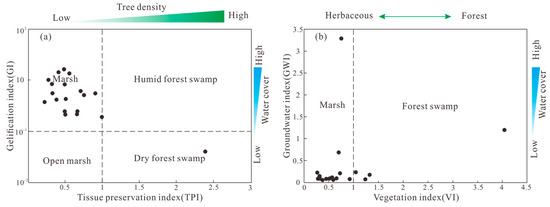 The TPI indicates the extent of tissue degradation and the preservation level of plant cell structures in coal-forming plants. The TPI >1 indicates a dominance of woody plants, with well-preserved cell structures and minimal degradation, while a TPI ≤ 1 indicates herbaceous plant dominance, with poorly preserved cell structures and significant degradation. The GI reflects water coverage in peat bogs and the degree of gelation in plant debris. Since gelation is primarily influenced by pH, the GI value also indicates the acidity or alkalinity of the peat bog. The GI > 1 indicates a humid climate with deep water coverage and a relatively alkaline environment, whereas a GI < 1 indicates a drier, acidic environment with shallow water coverage [69,70].