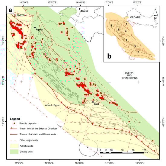 (a) Deposits and occurrences of bauxites in Croatia (red dots; source: Map of Mineral Resources of the Republic of Croatia, Croatian Geological Survey) [45] within Adriatic (yellow area) and Dinaric (green area) units in Croatian karst Dinarides. (b) Geographical position of External Dinarides in the Republic of Croatia (orange area). The numbers represent seven subregions of the Republic of Croatia: 1. Banovina and Kordun, 2. Istrian peninsula, 3. Kvarner coast and Velebit foothill, 4. Lika, 5. Northern Dalmatia, 6. Central Dalmatia, and 7. Southern Dalmatia.
