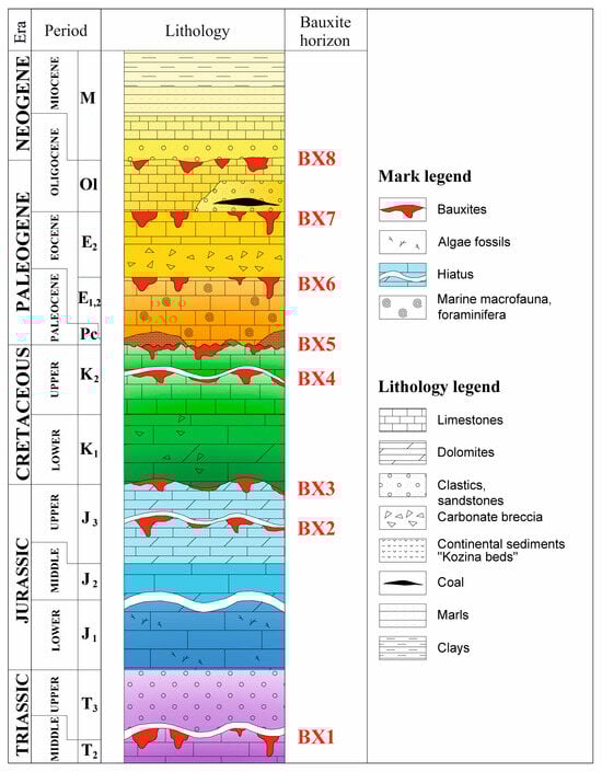 Stratigraphic positions of bauxite-bearing horizons in the schematic representation of the Croatian karst Dinarides: BX1 Upper Triassic, BX2 Upper Jurassic, BX3 Lower Cretaceous, BX4 Upper Cretaceous, BX5 Paleocene, BX6 Middle Eocene, BX7 Upper Eocene, and BX8 Miocene. Modified from [42].