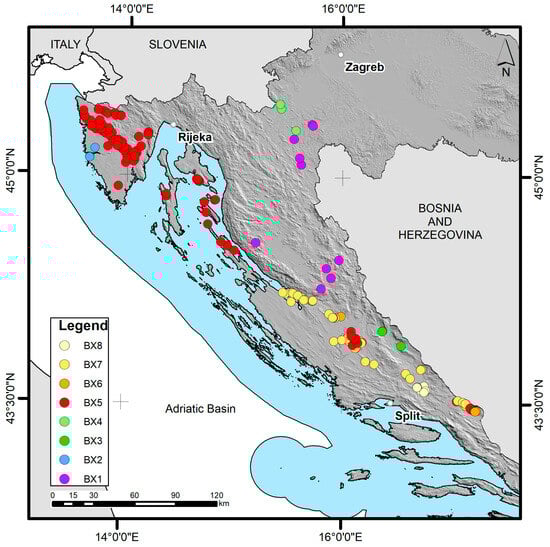 Locations of the sampled bauxite deposits from eight bauxite-bearing horizons from the Upper Triassic to the Miocene (BX1–BX8) in the study area (Croatian karst Dinarides).