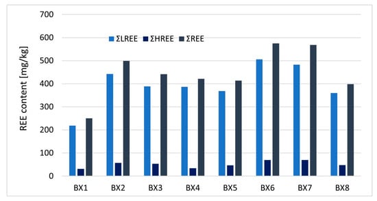 Diagram showing median values of ΣLREE, ΣHREE, and ΣREE in the Croatian karst bauxite horizons (BX1–BX8).