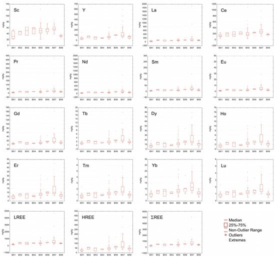 Box-and-whisker plots showing abundances of REE elements (including Sc and Y), LREE, HREE, and ΣREE (displayed in mg/kg) in the Croatian karst bauxite horizons. The plots represent univariate statistics of geochemical data (descriptor variables min–max, median, and first and third quartile values) for each bauxite horizon (BX1–BX8).