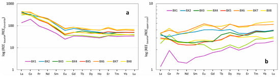 REE patterns for median values from the Croatian karst bauxite horizons (BX1–BX8) normalized to (a) chondrite and (b) upper continental crust. The normalization factors are from [55] (chondrite) and [60] (UCC).