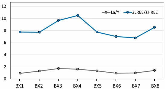 The behavior of REE in bauxite deposits is controlled by the physicochemical conditions, particularly Eh and pH, of the environment during weathering processes that lead to their formation [68]. The La/Y ratios were calculated to help interpret the REE distributions in the bauxite horizons and determine the pH conditions during the bauxitization process. Variations in La/Y in bauxites reflect changes in the pH during bauxitization [33,62,69]. Specifically, La/Y values less than 1 indicate acidic conditions, as observed in the Upper Triassic (BX1) and Middle Eocene (BX6) bauxites, whereas values greater than 1 indicate basic conditions, as observed in other horizons (Figure 10). According to Crnički [70], weathering under basic conditions leads to the enrichment of LREE, while under acidic conditions, their concentration, in relation to HREE, decreases. A comparison of the ΣLREE/ΣHREE value curves with those for the La/Y ratio for the bauxite groups (Figure 8) reveals a similar trend, confirming that the bauxitization processes for the Upper Triassic (BX1) and Middle Eocene (BX6) bauxites likely occurred in an acidic environment, whereas basic conditions prevailed for the other groups.