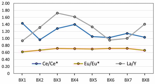 Variation in Ce-anomalies, Eu-anomalies, and La/Y ratios for the Croatian karst bauxite horizons (BX1–BX8). The values represent the median values for a particular horizon.