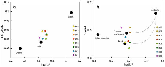 (a) Eu/Eu* and TiO2/Al2O3 binary diagram (modified after [28]). (b) Eu/Eu* vs. Sm/Nd binary diagram showing mixing lines between average standard lithologies. Modified after [56]. Colored circles represent the median values of the Croatian karst bauxite horizons (BX1–BX8).