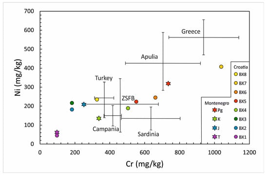 Binary diagram of Cr vs. Ni showing the median composition of the bauxite horizons relative to other Mediterranean karst bauxite deposits represented as average values and standard deviations. Colored circles represent the median values of the Croatian karst bauxite horizons (BX1–BX8). Colored stars represent median values of Montenegrin bauxite from four stratigraphic horizons [36] (modified after [28]).
