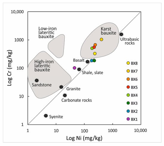 Binary diagram showing the concentration of Cr vs. Ni in laterite- and karst-type bauxites and potential precursor rocks. Colored circles represent median values of the Croatian karst bauxite horizons (BX1–BX8) (modified after [75]).