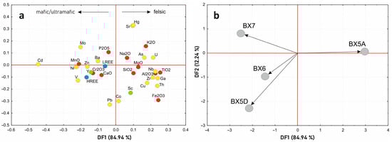Comparison between variables and Croatian karst bauxite horizons in the discriminant function model (DFM) of the clr-transformed data: scatterplots of (a) variable loadings and (b) bauxite horizons in the reduced discriminant space of the first two discriminant functions (DF1–DF2).