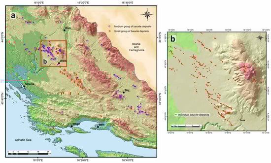 (a) Distribution of bauxite deposit groups in Central Dalmatia, (b) detailed density of individual deposits (source: Map of Mineral Resources of the Republic of Croatia, Croatian Geological Survey) [45].