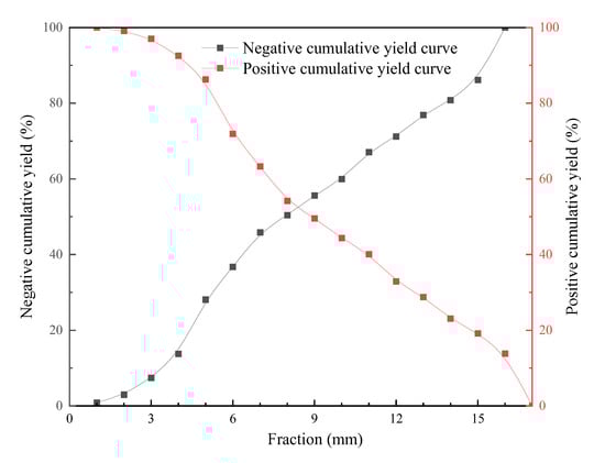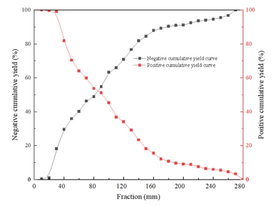 The raw ores were gold ores and were taken from a mine in Yunnan Province (China), and manually and mechanically screened (BXF Cyclone Particle Size Analyzer, Beijing General Research Institute of Mining and Metallurgy, Beijing, China). The fraction composition of feed and discharge of the SAG mill were as seen in Figure 1 and Figure 2. According to Figure 1, (1) the particle size of 95% screened for SAG mill feed is 188.11 mm; (2) the yield of coarse fraction with +100 mm acting as SAG mill media is 35.91%; and (3) the yield of the pebble of −80 - +25 mm is accounted for as 14.61%, which is relatively large and easy to form the accumulation of pebble. It can be illustrated from Figure 2 that each fraction of discharge is even on account of the cumulative curve approaching a straight line.
