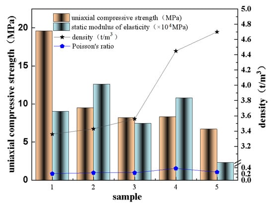 The mechanical properties of ore were tested (shear resistance, microcomputer controlled electro-hydraulic servo pressure testing machine, YAW4206T, Metus Industrial Systems (China) Co., Ltd. Shenzhen branch, Shenzhen, China; compression, computer automatic constant stress testing machine, DYE-2000S, Tianjin Metes test machine factory, Tianjin, China), and the results of mechanical properties of ores are shown in Figure 3.