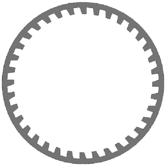 Firstly, according to the length and radius of the cylinder liner of an SAG mill, the physical model of the liner was built with the steel quality in SolidWorks software (2018 version), as shown in Figure 4. However, to carry out efficient simulation, an axial slice with a thickness of 0.3 m in the middle position of an SAG mill was taken to represent the whole mill (Weerasekara, Powell, et al., 2013) [20]. Next, the lifter bars with heights of 190 mm, 210 mm, and 230 mm, respectively, angles of 20°, 25°, and 30°, respectively, and group numbers of 12, 18, and 24, respectively, were drawn in the software. Being consistent with production conditions on site, the mill rotation rate, ore filling rate, and media filling rate were set to 76%, 22%, and 13%, respectively.