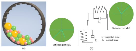 During distinct element simulating, the Hertz Mindlin contact model, one of the many contact models, has more advantages in the simulation tests of non-viscous granular particles (Xu, Kafui et al., 2002) [21] because the contact model can match the nonlinear function relationship of contact stiffness with contact displacement and contact force and can simulate the impact behavior between particles. In the herein simulation tests, it is established that there is no bonding force among the ore, and the contact relationship between the particle model elements has the characteristics of nonlinear and anisotropic, which is consistent with the advantages of the Hertz Mindlin contact model. Therefore, the Hertz Mindlin (no slip) contact model is chosen in this paper.