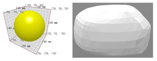 It would take months, if not years, to simulate the actual particle size of the ore, so the shape and size of ore particles usually were optimized (Govender, Rajamani, et al., 2018) [23] to improve the simulation speed on the premise of ensuring simulation accuracy. To make the ore particles closer to the situation on site, it was represented by irregular geometry shapes drawn by CAD, whereas the grinding media particles were represented by spheres, as shown in Figure 6. The grinding media of an SAG mill used in this simulation were steel balls with 140 mm and 127 mm, and the size of the ore particle was set at 250 mm, 200 mm, 150 mm, 120 mm, 100 mm, 80 mm, 45 mm, and 35 mm, respectively. The shape and number of materials inside the mill were generated by EDEM. The materials’ composition is shown in Table 1.