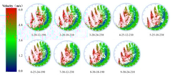 The EDEM simulation tests were carried out randomly according to the orthogonal test scheme to reduce the test error. The movement states with different schemes are shown in Figure 7.