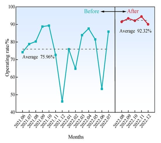 The operating rate results of the SAG mill before and after the lifter bars were optimized are shown in Figure 8.