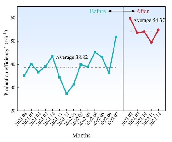 As can be seen from Figure 8, the average operating rate before and after the lifter bars were optimized was 75.96% and 92.32% respectively, with the operating rate after the lifter bars were optimized being 16.36 percentage points higher than that before the lifter bars were optimized, indicating that the optimized lifter bars can better meet the ores’ mechanical properties; that is to say, under the same condition, the higher the operating rate is, the greater the production capacity and the better the benefit is.