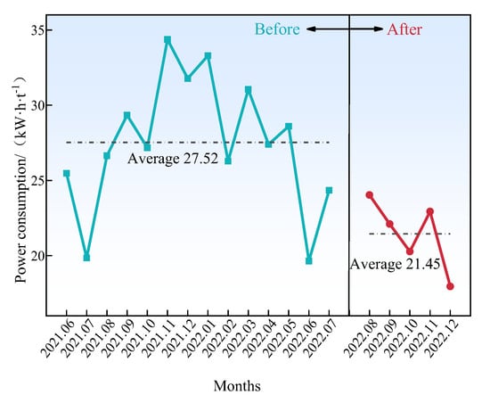 Electricity consumption of the mill is an important technical and economic index in the beneficiation plant, reflecting the comminution efficiency of the grinding media on ores inside the mill. Since the electricity consumed by the mill is a function of the power draw, the change in electricity can also reflect the change in the power draw. So, through analyzing the change in the electricity consumption during SAG mill operation, the comminution efficiency of the grinding media inside the mill before and after the lifter bars were optimized can be known in another form. The electricity consumption of the SAG mill before and after the lifter bars were optimized is shown in Figure 10.