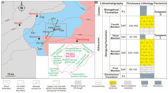 (A) Location map illustrating the key structural features of the PS8 well area (modified after [23]). The solid black line from “a” to “b” represents the location of the cross-section passing through four wells in the Penglai Gas Field, whereas the solid green line indicates the seismic cross-section. The insert map shows the central Sichuan paleo-uplift with a focus on the Penglai Gas Field, which includes the studied PS8 well. The red solid star marks the position of the PS8 well. The blue background represents the platform margin belt of the Dengying Formation, while the red background denotes the intrastage belt of the Dengying Formation. (B) Generalized lithostratigraphic chart of the Dengying Formation in the PS8 well, showing the various lithofacies changes, their corresponding thicknesses, and the tectonic movements during deposition.