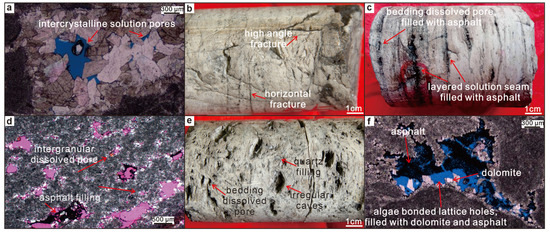 Core samples and cast thin section photomicrographs under polarized light microscopy from the Fourth Member of the Dengying Formation in the PS8 well. (a) A blue cast thin section photomicrograph shows intercrystalline dissolved pores within algal-laminated dolomite, sample depth 7058.04 m. (b) Algal-clotted dolomite exhibits horizontal and high-angle fractures, which are partially filled with bitumen, sample depth 6987.67–6987.79 m. (c) Algal-laminated dolomite features bedding-parallel dissolved pores filled with bitumen, sample depth 7240.89–7241.04 m. (d) A red cast thin section reveals algal-clotted dolomite with intergranular dissolved pores, some of which are partially filled with bitumen, sample depth 7092.42 m. (e) Sand-clast dolomite core shows numerous bedding-parallel dissolved pores and irregular vugs, with some vugs filled with quartz, sample depth 6986.50–6986.64 m. (f) A blue cast thin section reveals algal-clotted dolomite with algal-bonded pores, partially filled with dolomite and bitumen, sample depth 6983.53 m.