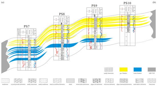 Based on well logging results, regional sedimentary background, and actual test data from individual wells of the Penglai Gas Field, the gas reservoir within the Fourth Member of the Dengying Formation has been examined (Figure 5). This reservoir is classified as a structural–stratigraphic gas reservoir, situated within a large monoclinic structural setting (Figure 5). In the horizontal plane, the distribution of the gas reservoir is controlled by both the slope structural background and lithological traps. To the south and east of the basin, the updip direction of the gas reservoir is characterized by impermeable, thick lithological zones within intraplatform depressions. In contrast, the northern and western sides are sealed by dense lithological zones formed in interbeach depressions. Vertically, the Fourth Member of the Dengying Formation constitutes a single gas reservoir. The upper sub-member of the Fourth Member is characterized by thick mound–beach karst reservoirs that are continuously developed across large areas and are gas-bearing. This upper sub-member is characterized by the presence of edge water in its lower parts, with a unified gas–water interface and a consistent pressure and temperature system. In contrast, the lower sub-member of the Fourth Member was deposited under deep-water environmental conditions, resulting in limited deposition and/or absence of mound–beach bodies [51,52]. Thus, it has less well-developed reservoirs, with limited lateral connectivity and fewer gas-bearing strata due to the separation between the gas reservoirs via compact lithologies, such as micritic dolomite, in both the updip and downdip directions, primarily consisting of water-bearing reservoirs. This results in variable internal trapped water interfaces during hydrocarbon migration. Additionally, this indicates that the upper sub-member of the Fourth Member shows a complex nature of being a structural–stratigraphic reservoir type [49,50,53].