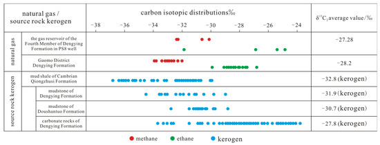 Distribution of carbon isotopes in kerogen of source rocks and natural gas in the Ediacaran–lower Paleozoic strata in the central Sichuan uplift (modified after [9]).