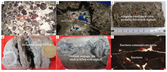Microscopic photographs and hand specimen cores showing syngenetic and epigenetic karst developed in the Fourth Member of the Dengying Formation. (a) Microscopic photograph illustrating the psammitic dolomite and moldic pore, sample depth 7243.6 m, well PS7. (b) Algal-clotted dolomite and moldic pore, sample depth 7063.56 m, well PS8. (c) Algal-clotted dolomite and irregular vug, partially filled with bitumen, sample depth 7060.5–7060.6 m, well PS8. (d) Micritic dolomite with a horizontal underflow, sample depth 6987.5–6987.6 m, well PS9. (e) Psammitic dolomite with vertical seepage and solution channel filled with bitumen, sample depth 7245.8–7245.9 m, well PS7. (f) Algal-clotted dolomite with interconnected pores by fractures, sample depth 7048.8 m, well PS8.