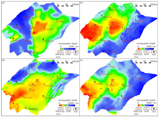 The central Sichuan paleo-uplift plays a crucial role in the formation and distribution of gas reservoirs in the Dengying Formation [68]. The tectonic evolution and burial history of the hydrocarbon source rocks in central Sichuan indicate that since its formation in the lower Cambrian, the uplift has experienced various evolutionary stages but generally exhibits characteristics of inherited development (Figure 8 and Figure 9) [69]. From the early Cambrian to the Permian (Figure 8a), the Deyang–Anyue rift trough and the central Sichuan uplift gradually formed and entered the development stage [70]. The entire basin exhibited a tectonic pattern of uplift in the west, a high region in the middle, and a depression in the southeast. During the Silurian, the northern slope underwent a subsidence phase, followed directly by significant uplift. During the subsidence phase, the source rocks of the lower Cambrian Qiongzhusi Formation, located on the northern slope of the Sichuan Basin, gradually entered the early mature stage of the oil window, with an average VRo exceeding 0.5% [71]. This led to the expulsion of a small amount of liquid hydrocarbons. Additionally, the temperature of the Qiongzhusi Formation ranged from 80 to 110 °C [72]. During this period, the PS8 well area consistently remained at a relatively high position within the central Sichuan paleo-uplift, making it an important area for gas migration and accumulation, thus fostering the formation and enrichment of ancient hydrocarbon reservoirs.