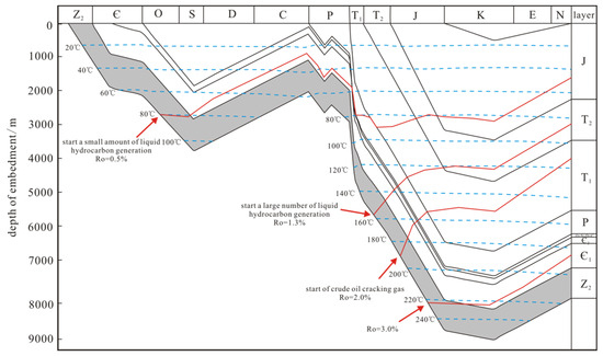 Thermal evolution and hydrocarbon charging history of source rocks in the Qiongzhusi Formation on the northern slope of the central Sichuan paleo-uplift (modified after [72]).