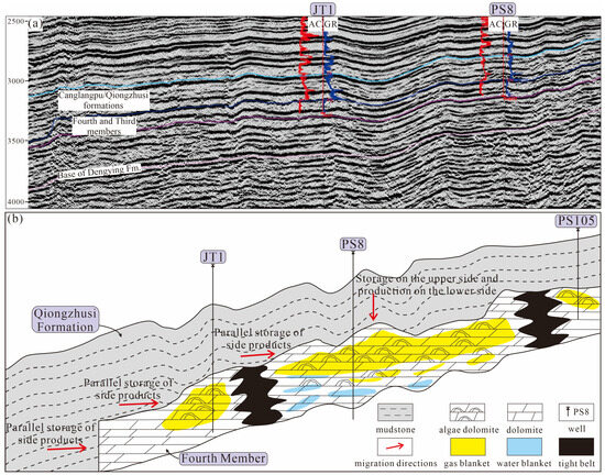 Based on the findings outlined above and a comprehensive analysis of previous studies on the Penglai Gas Field and adjacent hydrocarbon reservoirs [76,77,78,79,80,81,82,83], a gas reservoir formation model for the PS8 well is developed (Figure 10). In the Fourth Member of the Dengying Formation, the gas reservoirs are part of the second gas-bearing system, which lies above older sedimentary successions of the Sichuan Basin, including the Ediacaran–lower Paleozoic gas-bearing system [84]. This karst reservoir, associated with the mound–beach facies in the Fourth Member, is capped by thick black mudstones and shales of the lower Cambrian Qiongzhusi Formation (Figure 10). The gas reservoirs in the Fourth Member exhibit two distinct modes: “lateral generation and lateral storage” and “upper generation and lower storage” (Figure 10a). To the west of the PS8 well, the Deyang–Anyue rift is located, where the Dengying Formation has been significantly uplifted and eroded due to the activation of the Tongwan II tectonic movement [67]. This uplift and erosion resulted in the complete removal of the Third and Fourth members of the Dengying Formation, leaving only the First and part of the Second members.