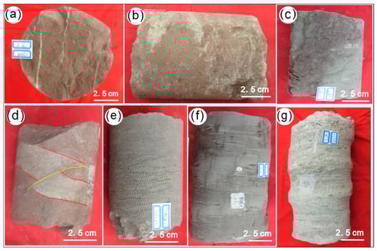 Mudstone facies with various structures: (a) Fsm, purple-red and brownish-red mudstones with calcite veins, Yi161, 3483.5 m; (b) Fsm, red mudstone, Kx627, 2350.5 m; (c) Fsm, randomly oriented gray ripped mudstone with mudcrack with sand, Yi160, 3681.55 m; (d) Fm, massive red mudstone with a reverse fault, Bs4, 5447.5 m; (e) Fsh, gray laminated mudstone with lens of erosional contact between mouthbar siltstone, XBs1, 3562 m; (f) Flm, regular alternation of light laminas into low angle fine, XYS9, 3794.6 m; (g) Fsh, Fl, claystone interbedded with thin siltstone, Yi130, 2333.5 m. The adhesive strips have no interest in these figures because the scripts and characters they do contain simply indicate the name of the well and the depth at which the samples were taken.