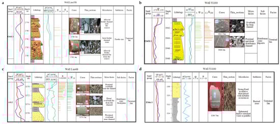 A diverse mixture of deposit types and facies is produced in the distribution zones of terminal fan systems by a combination of suspended material, wind activity, and channel sheet floods. The linear GR curves observed in sandy mudstone and silty mudstone suggest depositional environments such as distributary channels (Figure 5b), intertributary bays, and subaqueous distributary channels filled with mudstone (Figure 5c). However, the distributary channels are a combination of the sandy body of the river channel and the sandy body of the flood sheet; they are thinner than 5 m and several tens to hundreds of meters wide. Figure 3 shows the lithology of the core, which indicates that subfacies of the terminal fan occurred in the Bonan area. The distributary subfacies zone with well Yi193 features coarse sandstone, whereas in well Luo68, it features medium- and fine-grained sandstone with both moderate porosity and relatively good permeability (Figure 5c). Three different types of sedimentary microfacies are identified: (i) distributary channels; (ii) near-channel overflows or proximal sheet floods; and (iii) far-channel overflows or distal sheet floods.